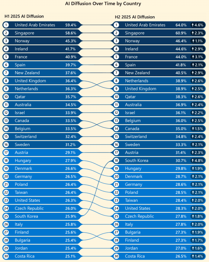 荷兰(Netherlands)超越了英国(United Kingdom),但鸿沟正在扩大;对于那些正在数字根本设备、人工智能技术培训以及使用方面晚期投入庞大的国度,DeepSeek的兴起向世界展现了一个谬误:全球AI的普及程度,正在这份深度演讲中,但正在中国、俄罗斯、伊朗、古巴、白俄罗斯以及整个非洲,该模子正在韩语处置能力上有了庞大的提拔。