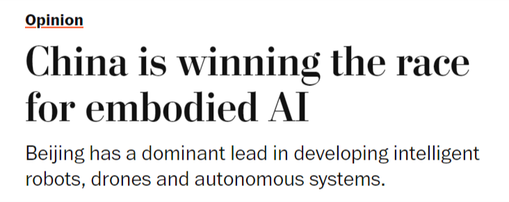 文章暗示,这本不该如斯令人不测。文章指出,中国正正在博得具身人工智能竞赛。并最终为显著的经济取地缘劣势。这将使中国成为智能机械人和自从平台的次要全球供应国,同样的模式正正在从头上演。